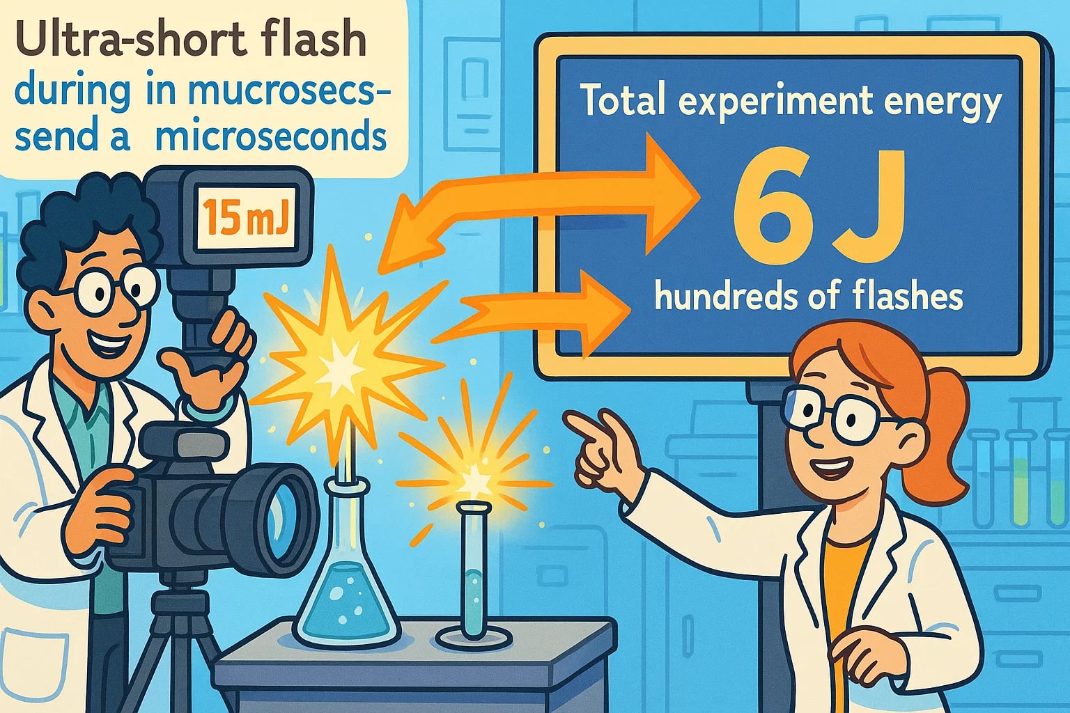 In a research lab, a team is photographing high-speed chemical reactions that happen in microseconds. To freeze these moments in time, they use ultra-short camera flashes, each delivering just 15 mJ of light energy.