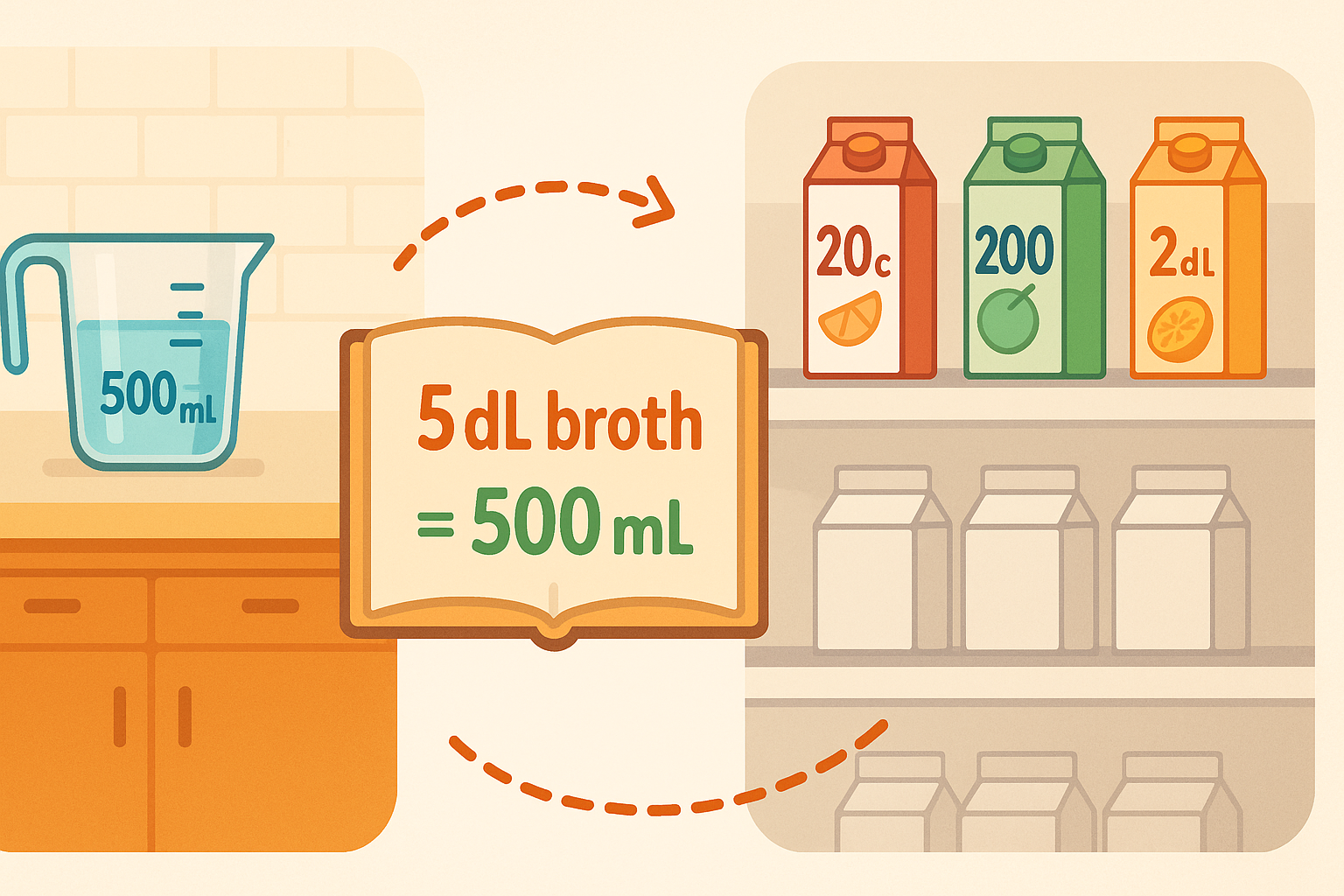 This conversion is visible in everyday cooking. A recipe might ask for 5 dL of broth, while your measuring cup only shows mL. Knowing that 5 dL = 500 mL lets you prepare the dish without confusion.