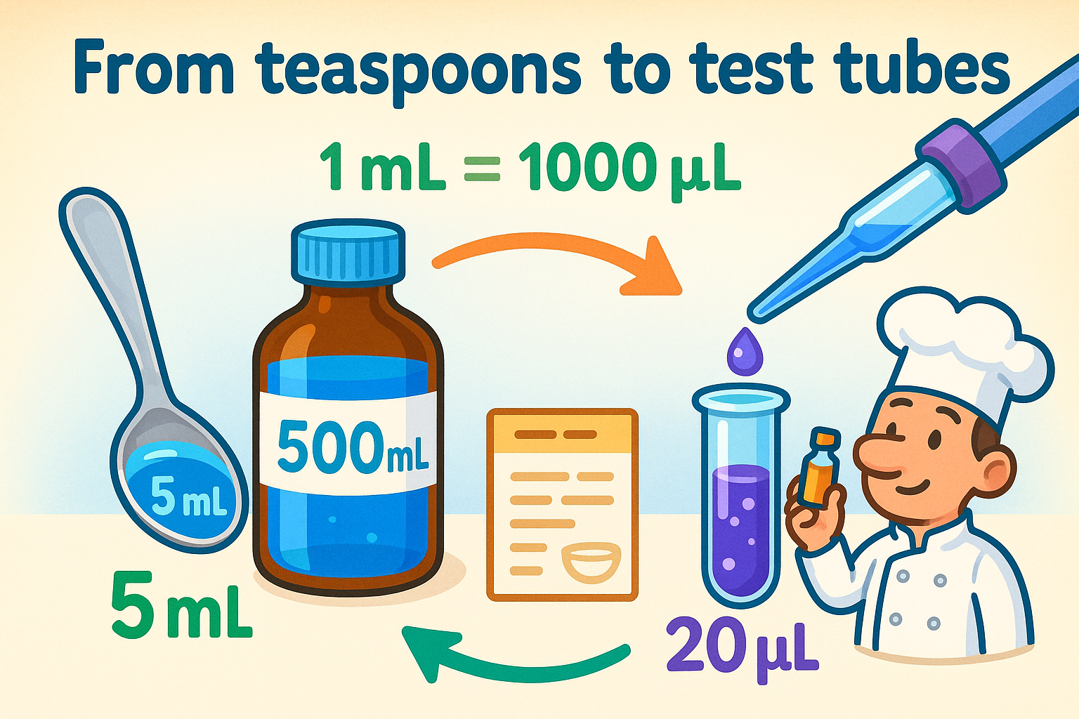 The same happens in food science, where a flavor extract measured in microliters during testing becomes part of a recipe listed in milliliters for consumer kitchens.