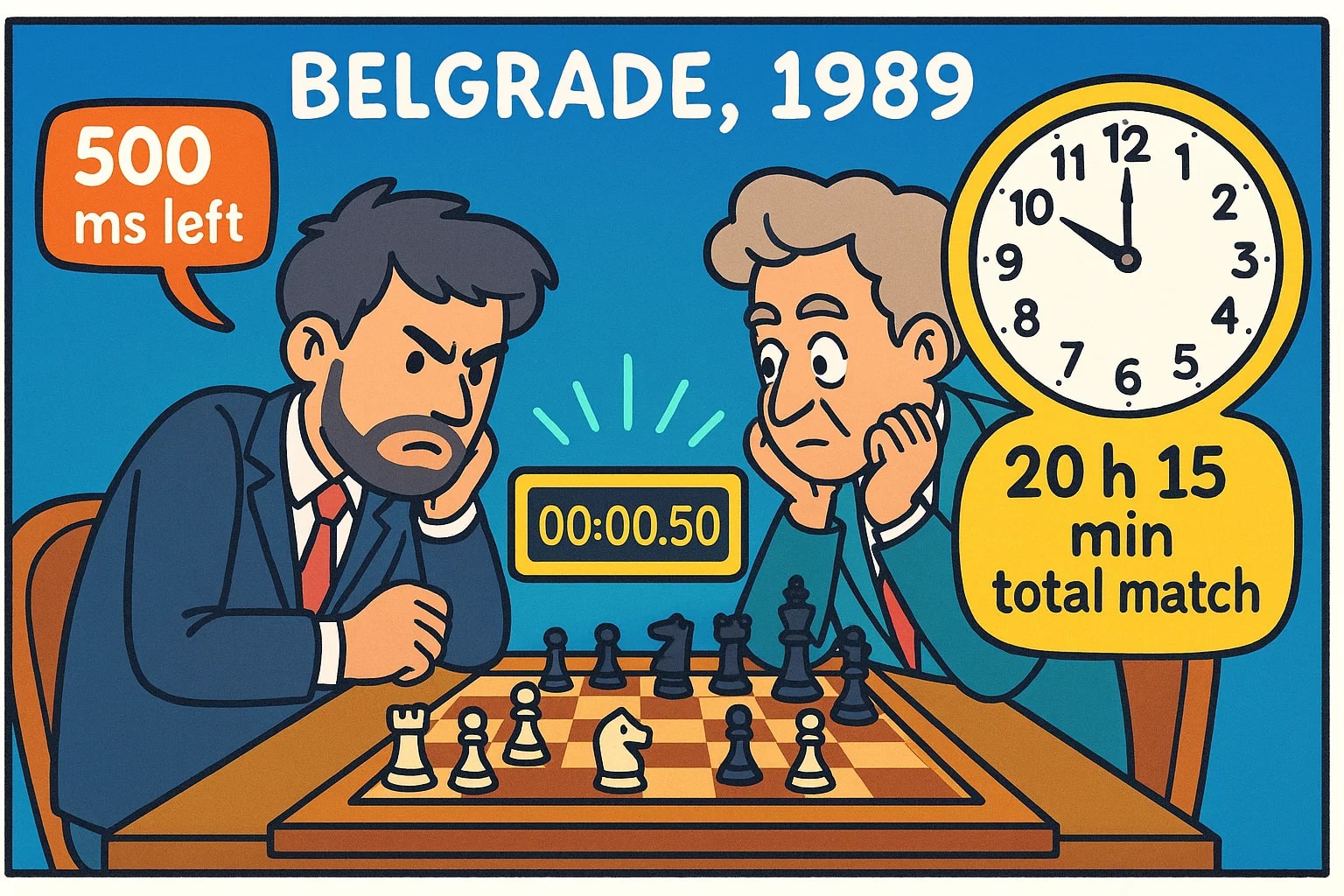 In 1989, in Belgrade, two grandmasters — Nikolić and Arsović — faced off in what became the longest official chess match in history. It lasted a staggering 20 hours and 15 minutes over 269 moves, ending in a draw.