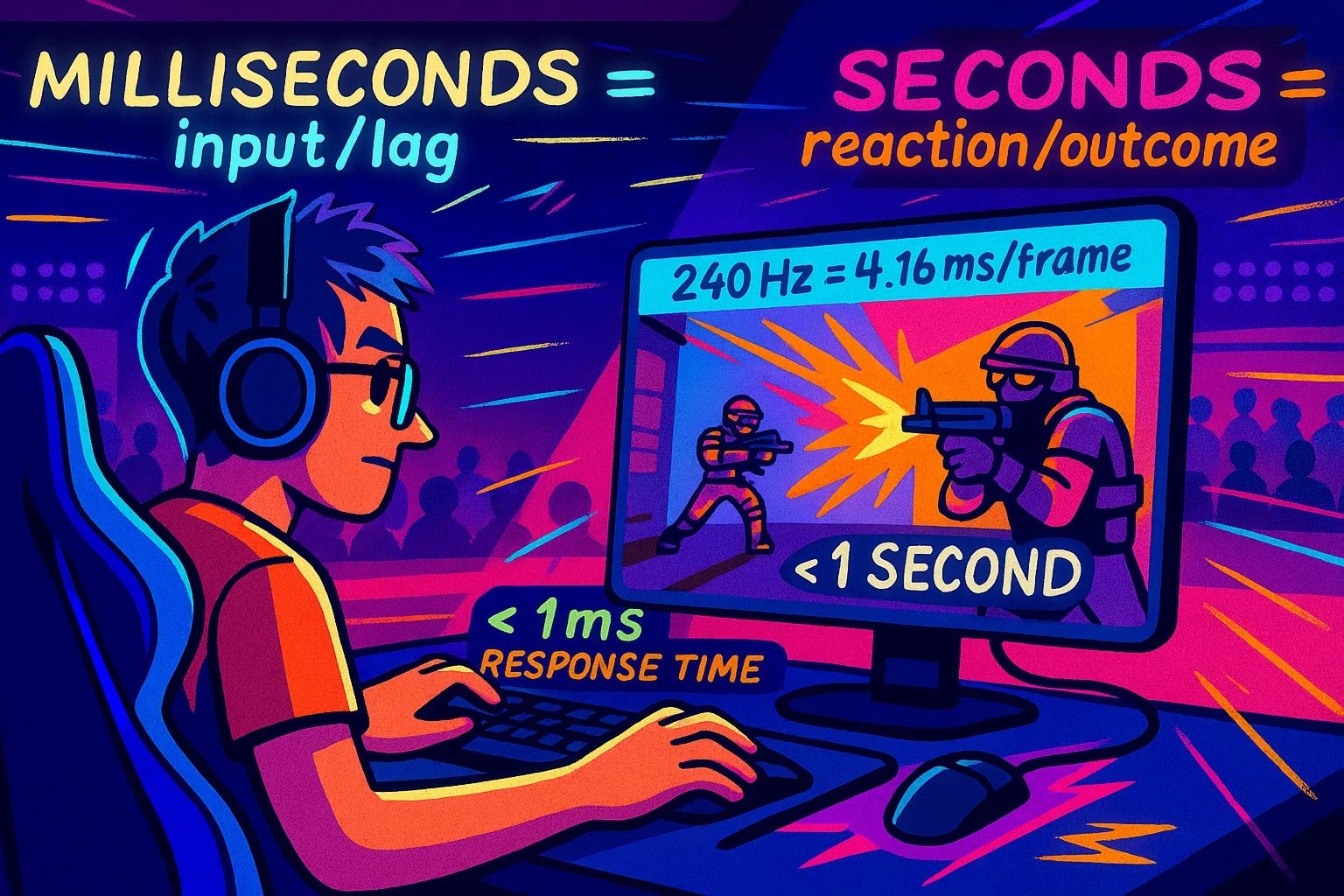 In competitive eSports, milliseconds can determine the outcome of seconds-long plays. Imagine a tense final round in a first-person shooter. Your opponent appears on screen for just under a second, and your ability to react relies on input lag, network latency, and reflexes — all measured in milliseconds.